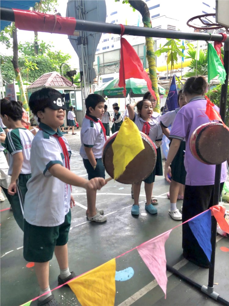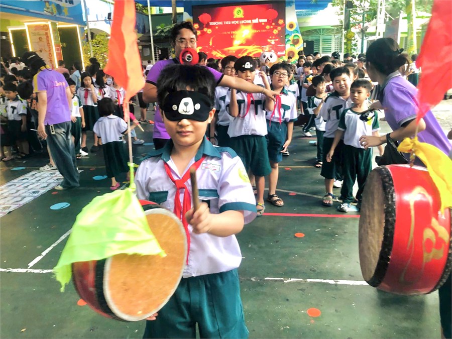 Các em học cách đánh trống thật vui tươi, tạo không khí phấn khởi và náo nhiệt trong các dịp lễ hội.